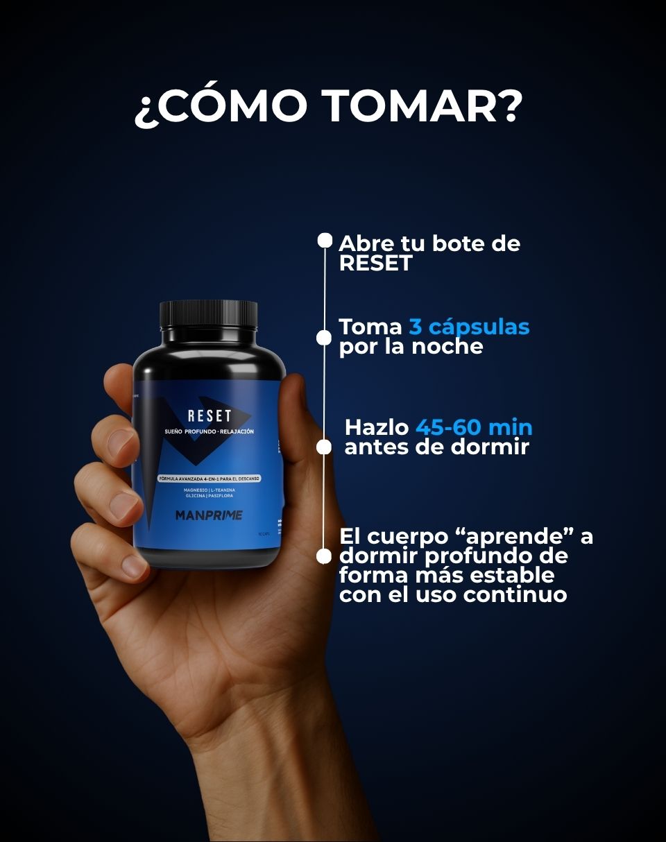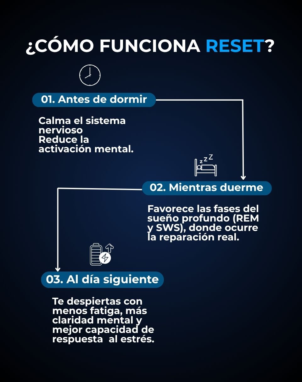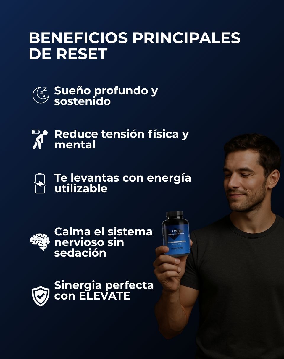 RESET es una fórmula masculina avanzada 4 en 1 diseñada para optimizar tu descanso y potenciar tu rendimiento desde la noche.